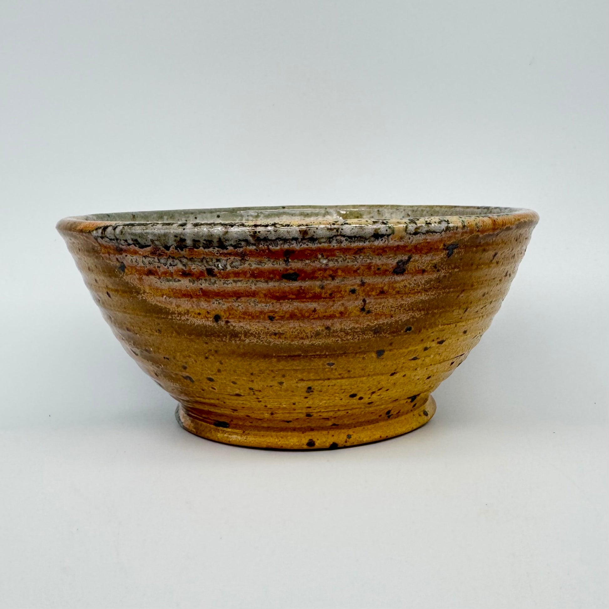 Set of six dessert bowls. Corrugated texture on the exterior with a huge verity of warm to cool yellow tones. Dark soda glaze accents. Numerous dark flecks from the inclusion of local crushed stone.