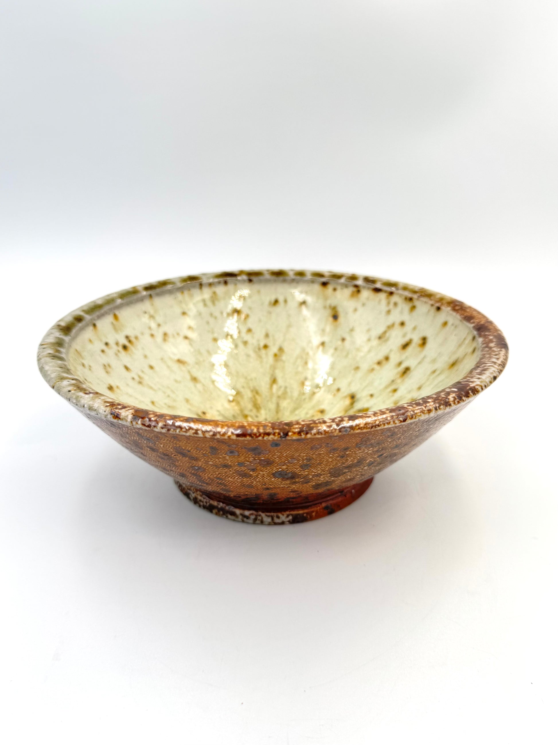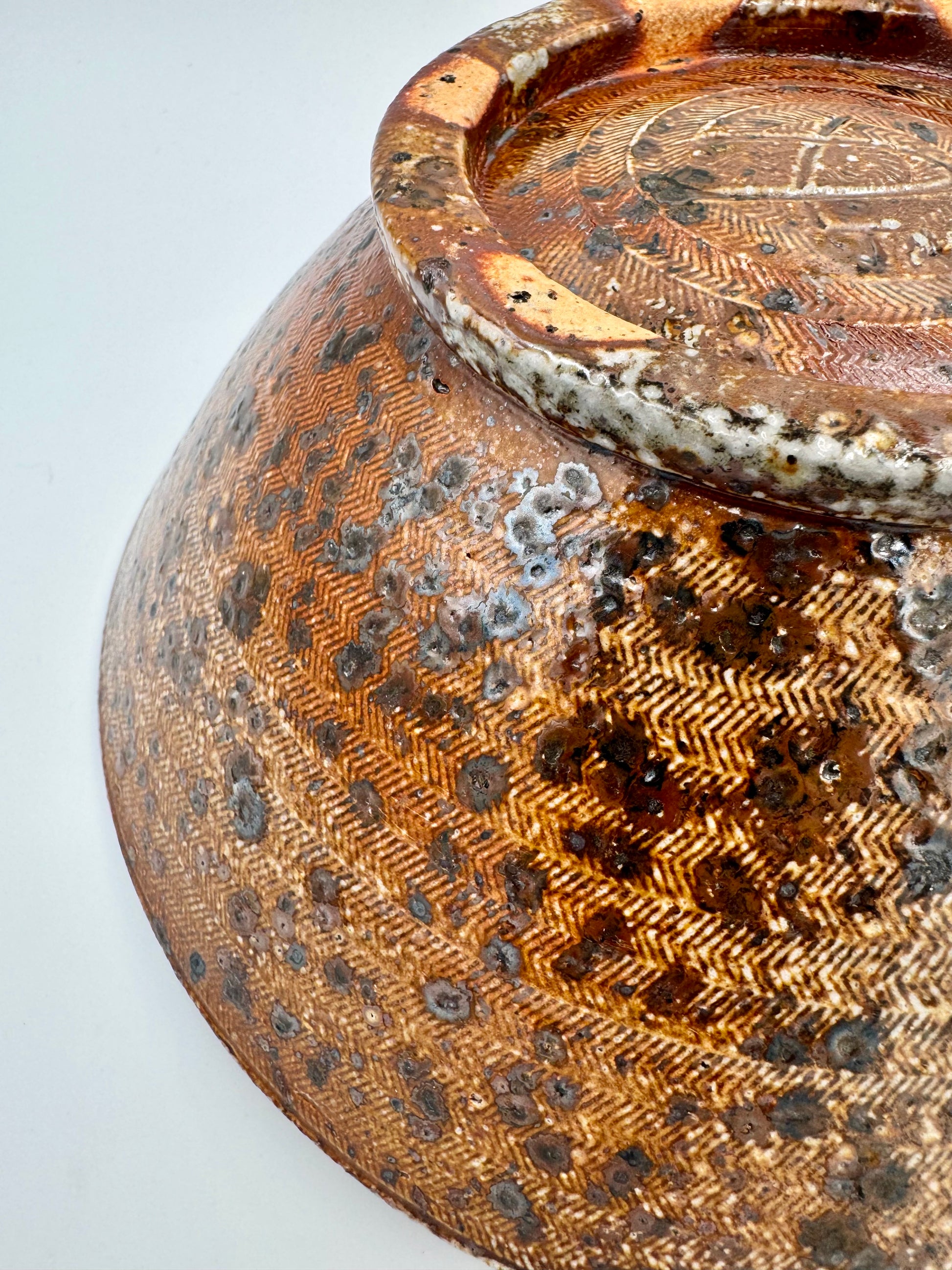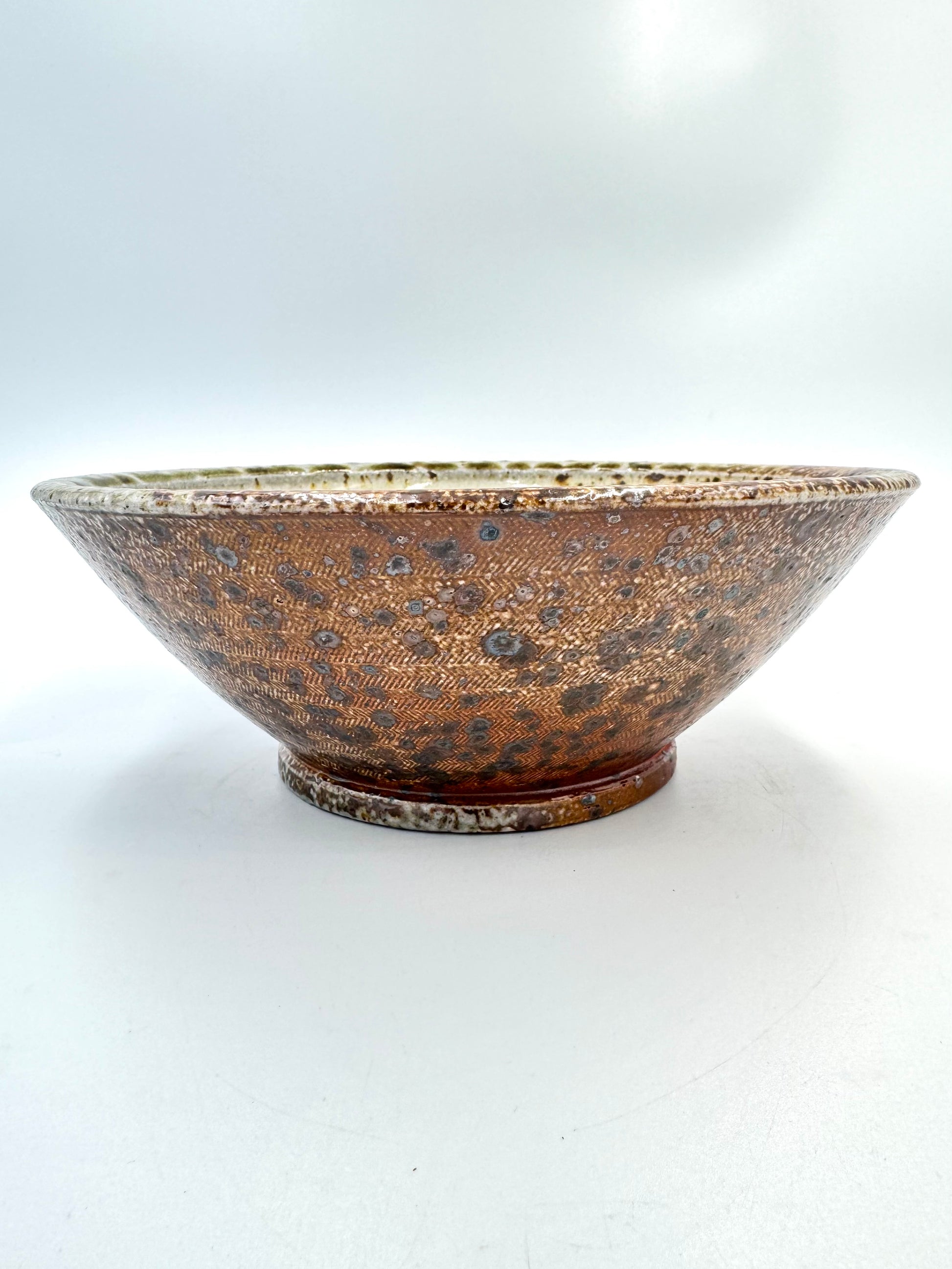Medium dinner bowl with dramatic finishes all around. Fine herringbone texture with warm earthy red/bronze flashing. Crushed local stone gives numerous dark flecks. 900ml approx (30oz or 3.75 cups)