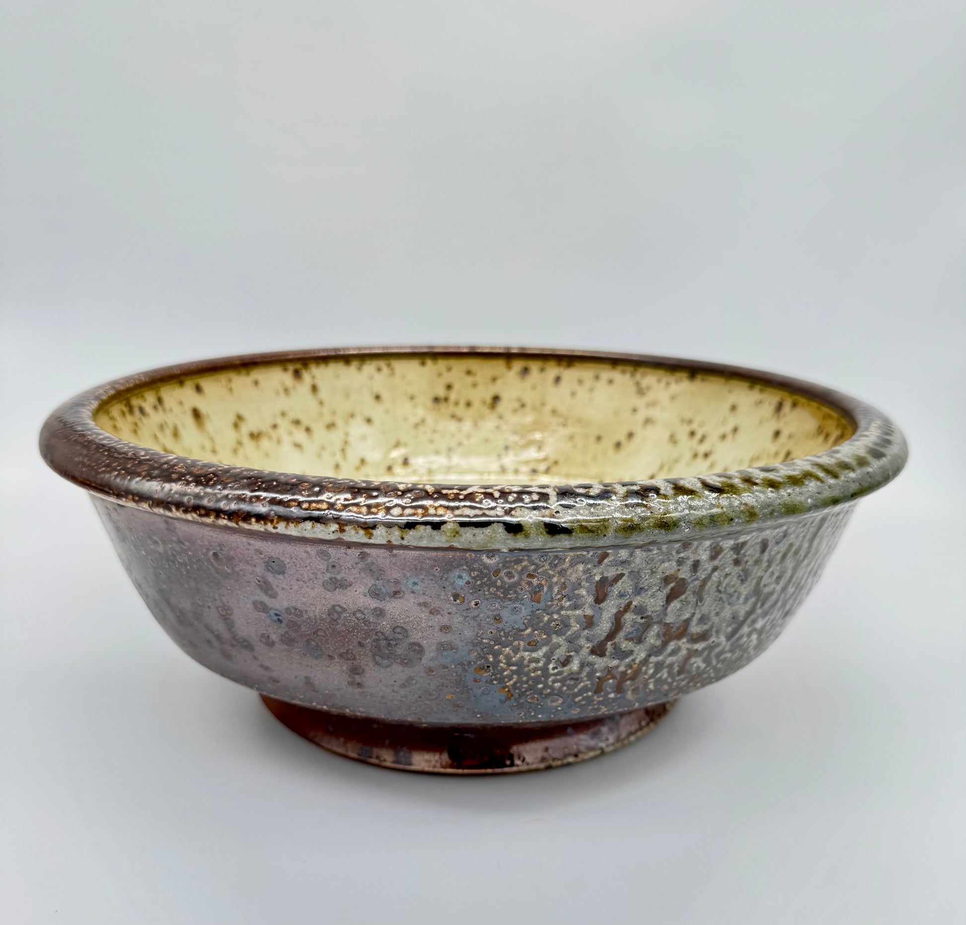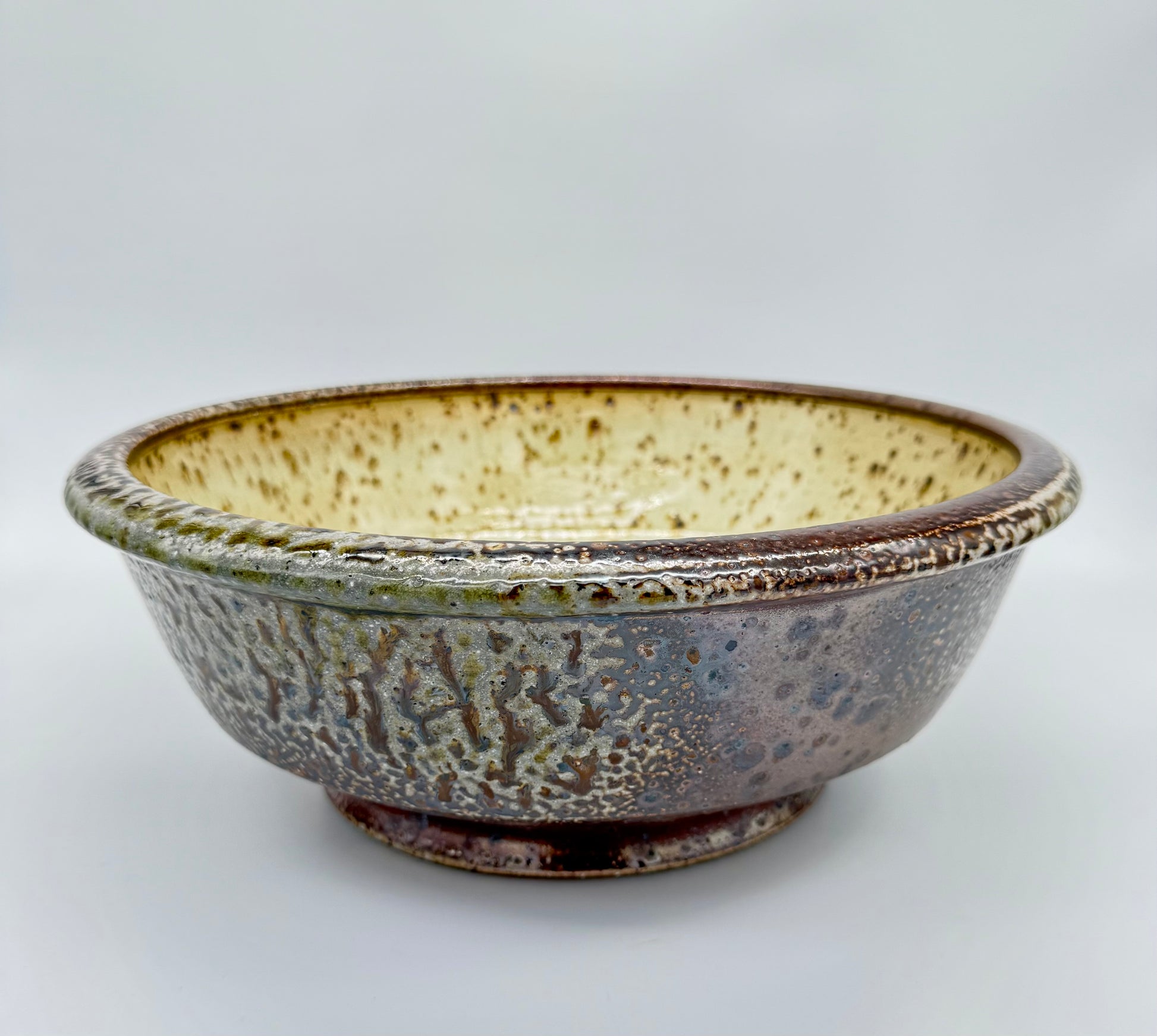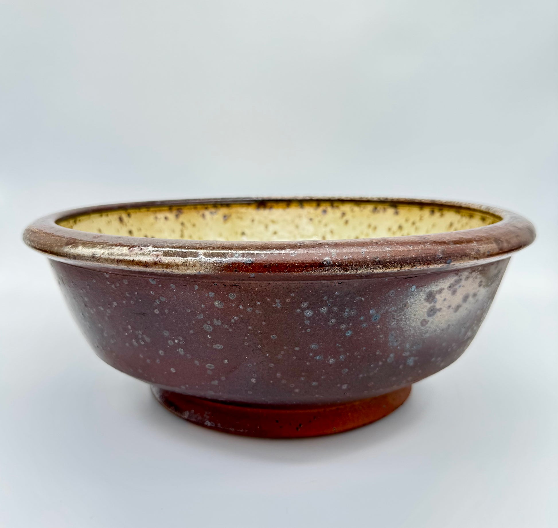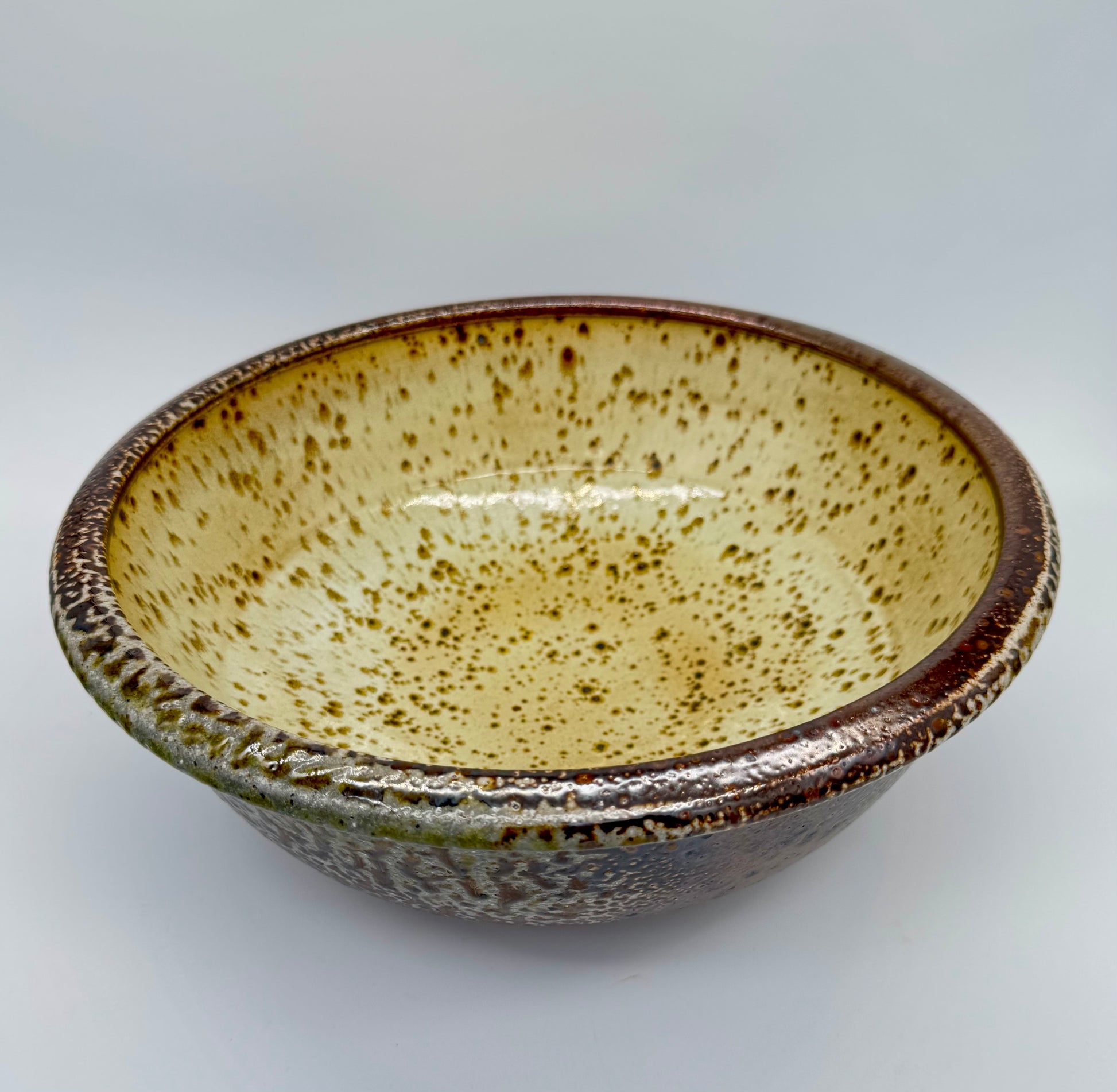 Large mixing or harvest bowl. Makes a good centerpiece. Great for mixing dough or filling with fresh produce from the garden. Deep cocoa tonnes with numerous dark spots from the addition of crushed local stone. Luxurious gloss glaze on the interior 32cm wide, 12cm height. I designed this bowl to be robust to last the ages. It has some heft to it.