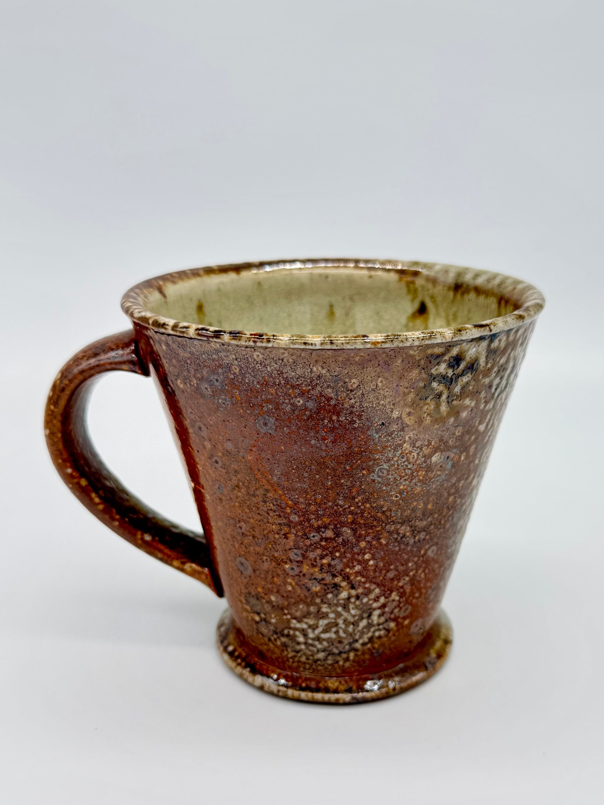 Mug with deep blushing bronze earthy tones. Classic orange peel soda glaze. Numerous dark flecks from the inclusion of crushed local stone in the clay. 354ml (12oz)