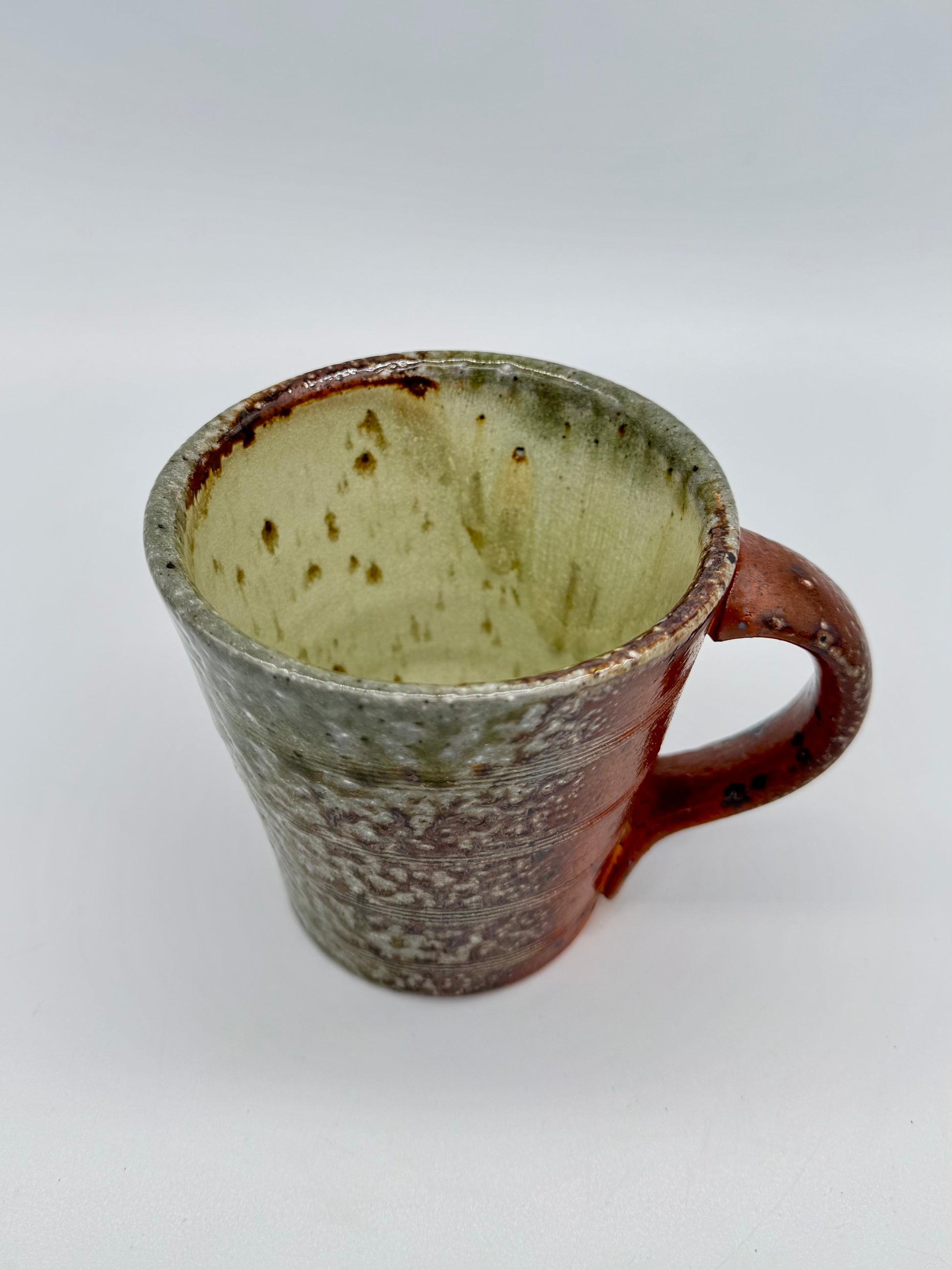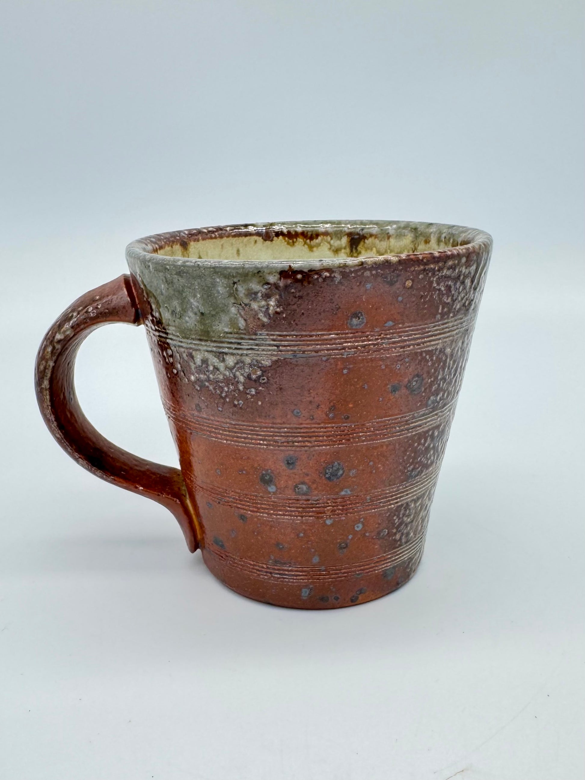 Textured mug with simple line pattern. Generous ash and soda deposit on one side and the other deep orange earthy tones. Many dark flecks from the inclusion of crushed local stone in the clay. 354ml (12oz)