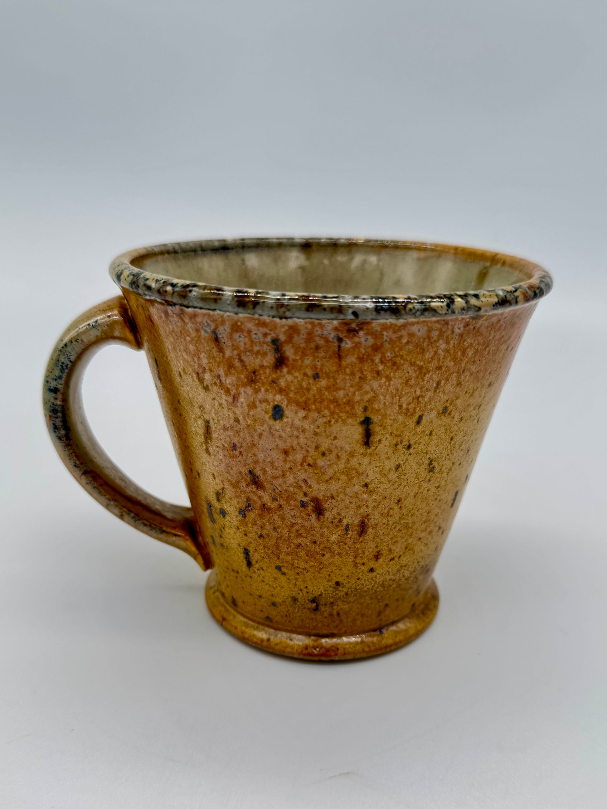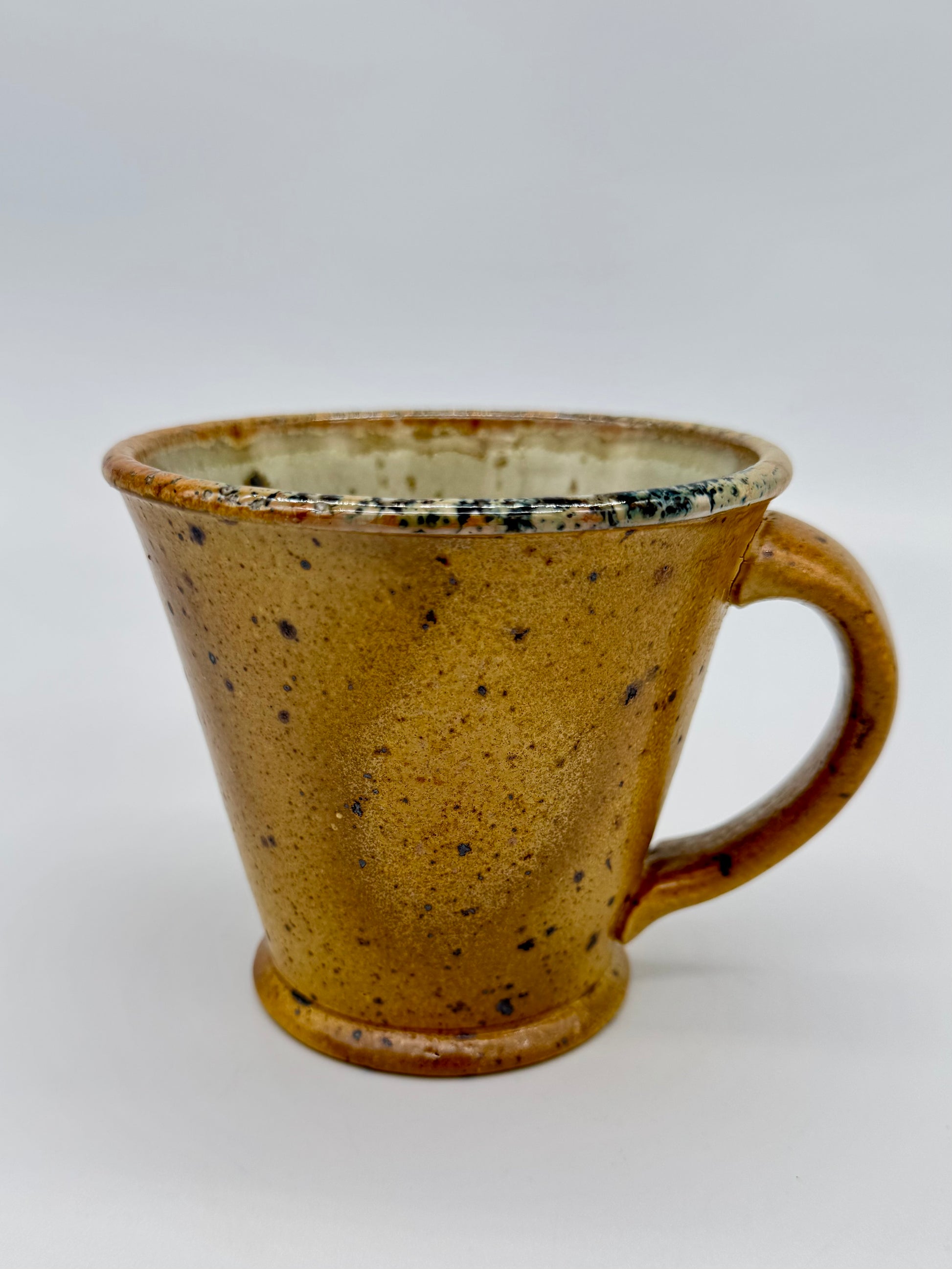 Titanium yellow mug with subtle variations of cool and warm yellow tonnes with a mix of satin and gloss surfaces. Light but luxurious soda glaze deposits. Numerous dark flecks from the inclusion of crushed local stone in the clay. 354ml (12oz)