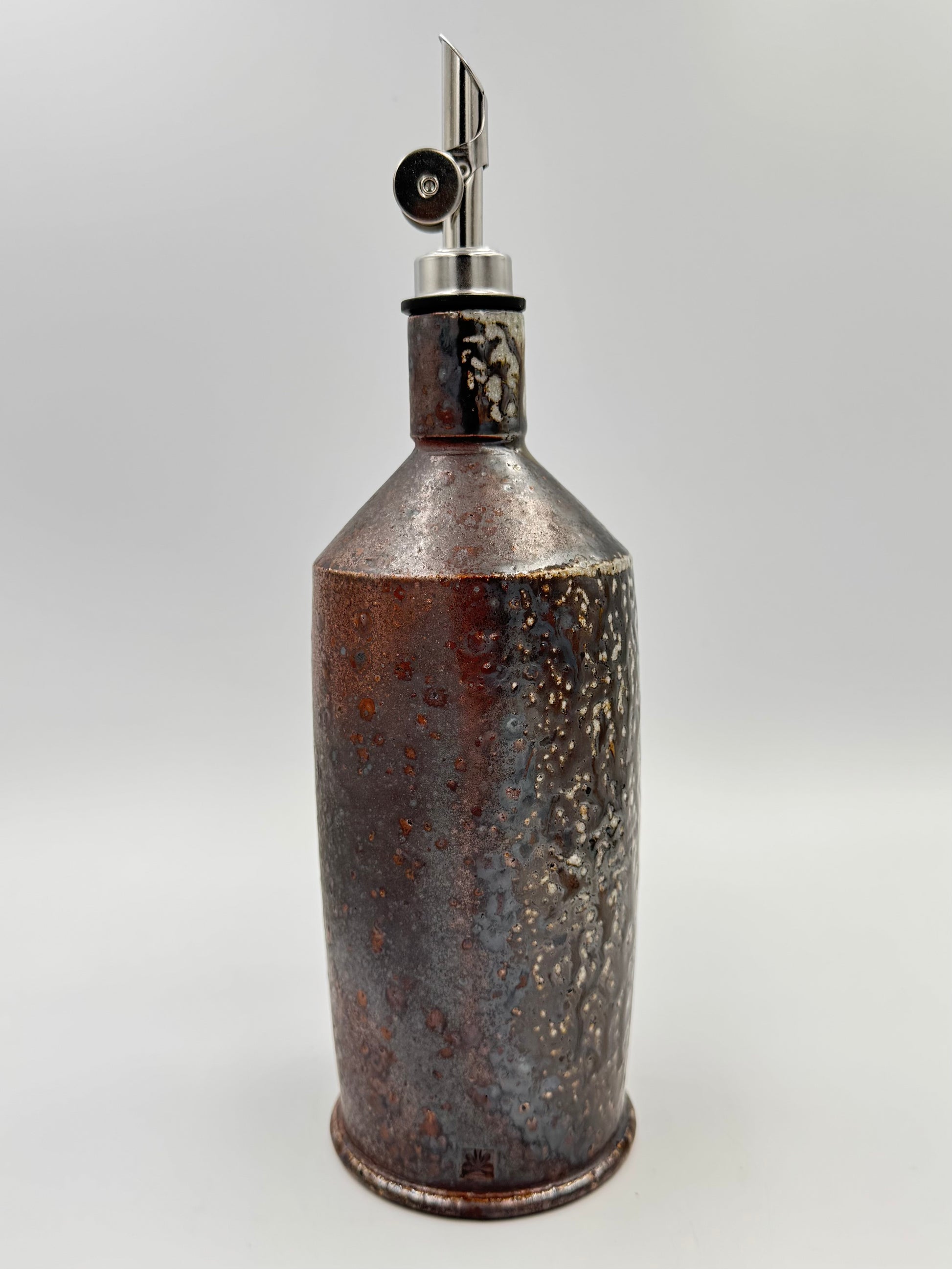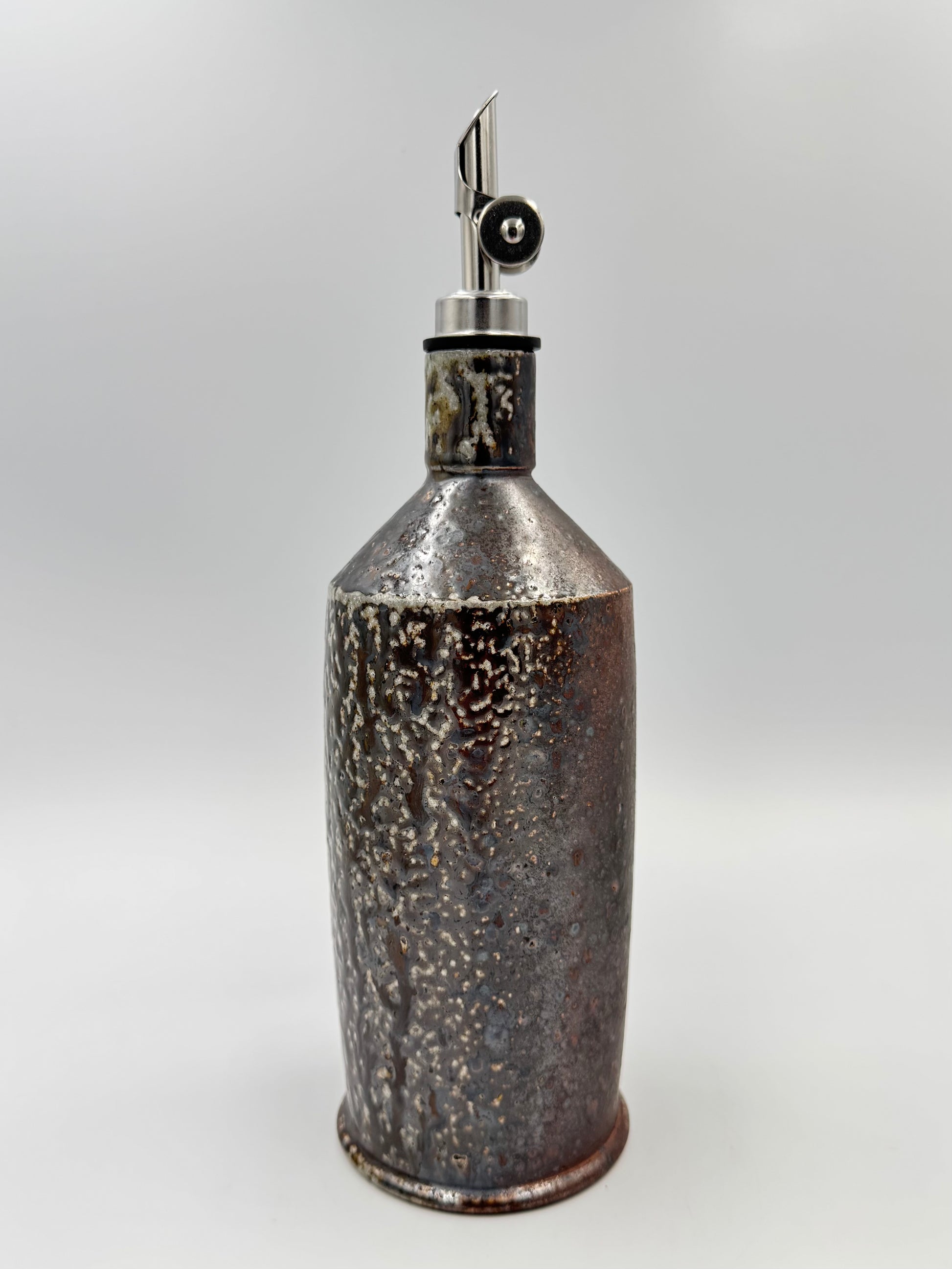 Dramatic surface with generous soda glaze deposits on a dark cocoa surface. Versatile and functional — these pourers also handle liquids less viscous than olive oil beautifully, such as gin, balsamic vinegar, and more.