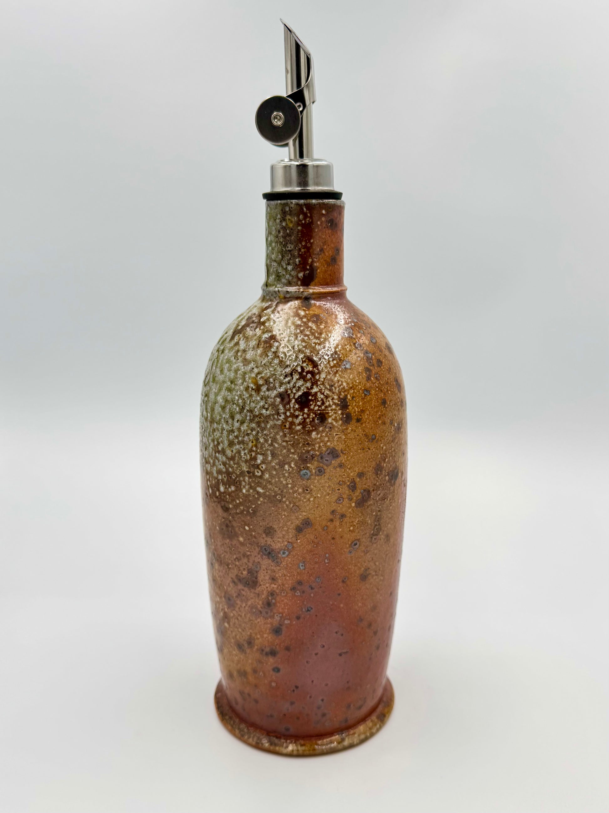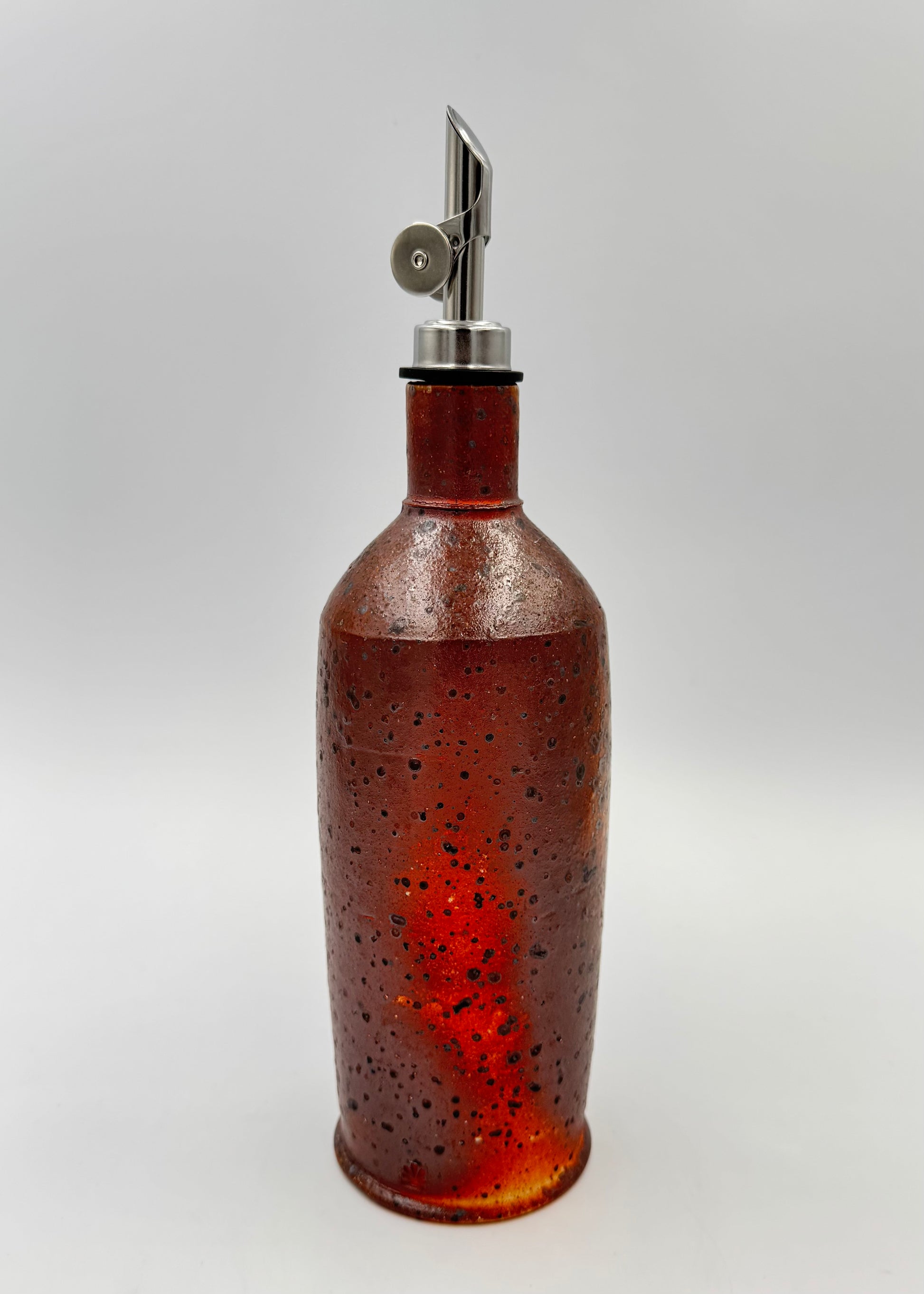 Earthy red and bronze tones with numerous dark flecks from locally crushed stone in the clay. A truly striking piece. Versatile and functional — these pourers also handle liquids less viscous than olive oil beautifully, such as gin, balsamic vinegar, and more.