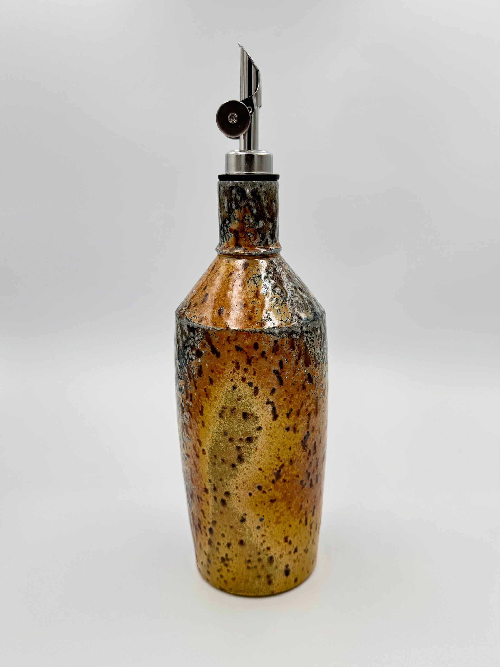 Dramatic surface with generous soda glaze and dark flashing. Cool and warm yellow tones with numerous dark flecks from locally crushed stone in the clay. Versatile and functional — these pourers also handle liquids less viscous than olive oil beautifully, such as gin, balsamic vinegar, and more.