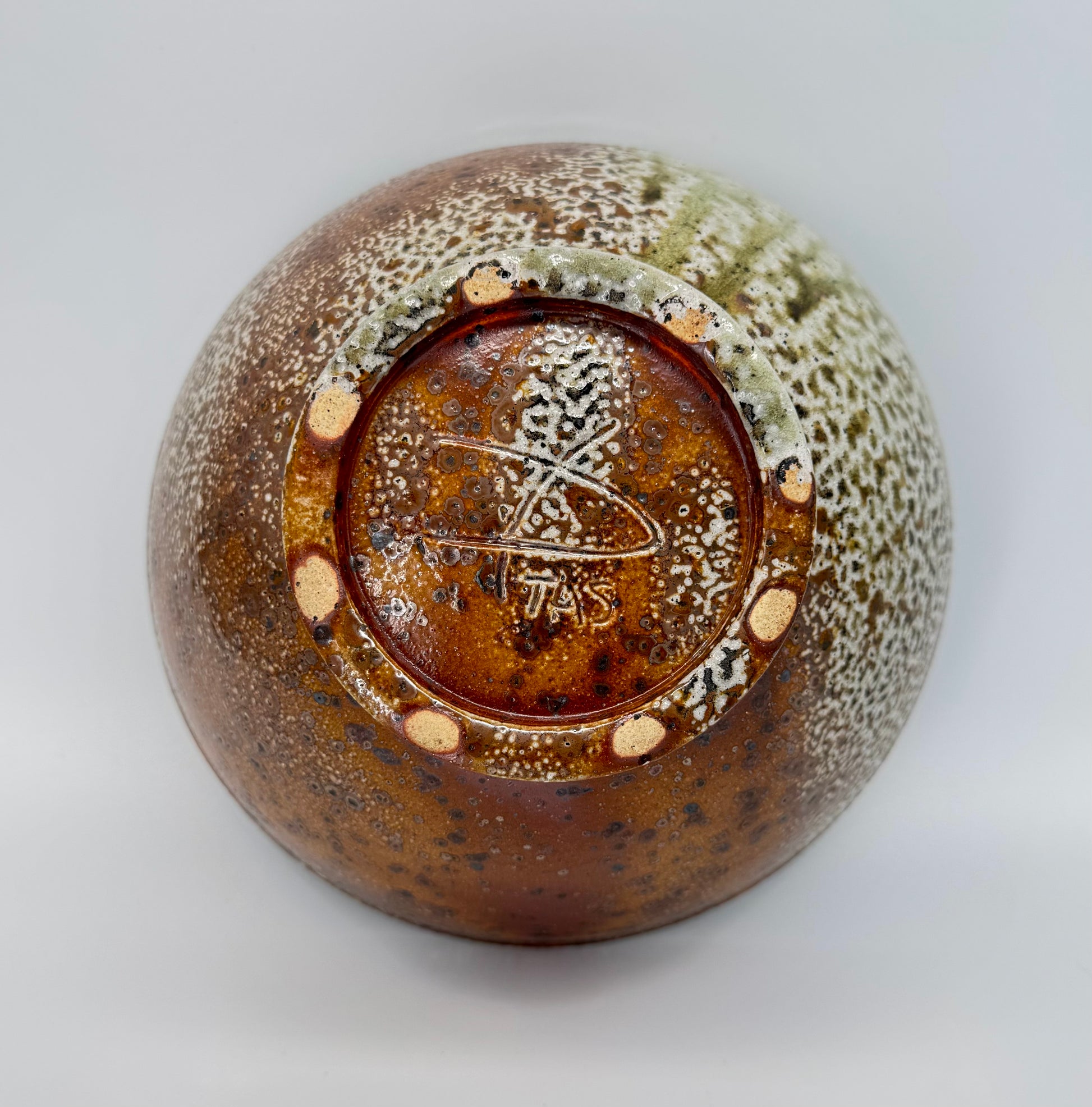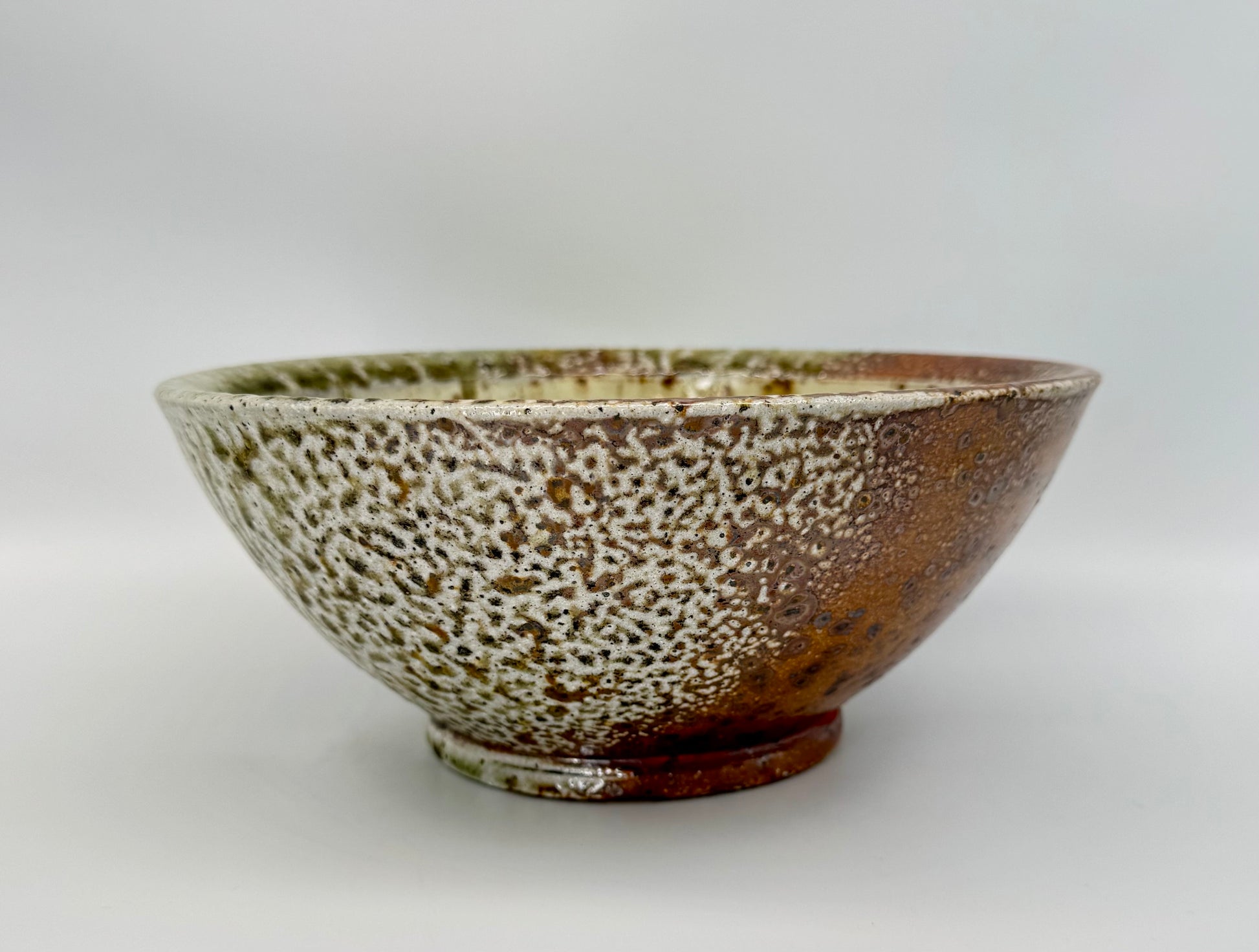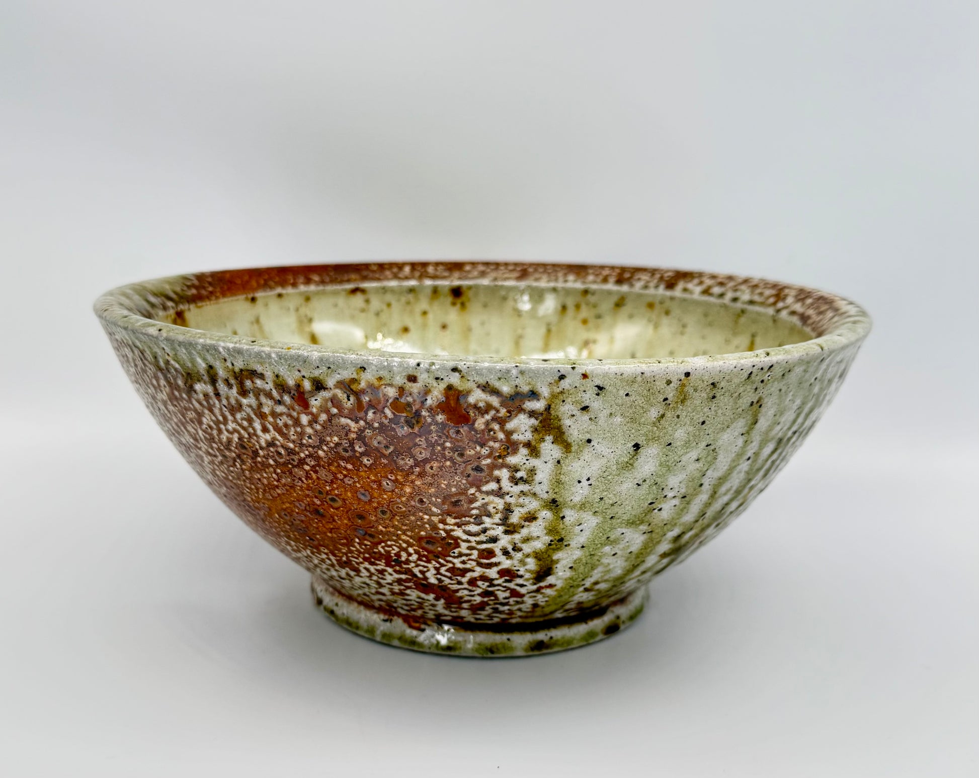 Generous sized ramen bowl with dark earthy red flashing, ample soda glaze forming rivulets and classic orange peel texture. Stunning bowl all around. 1000ml (4 cups)