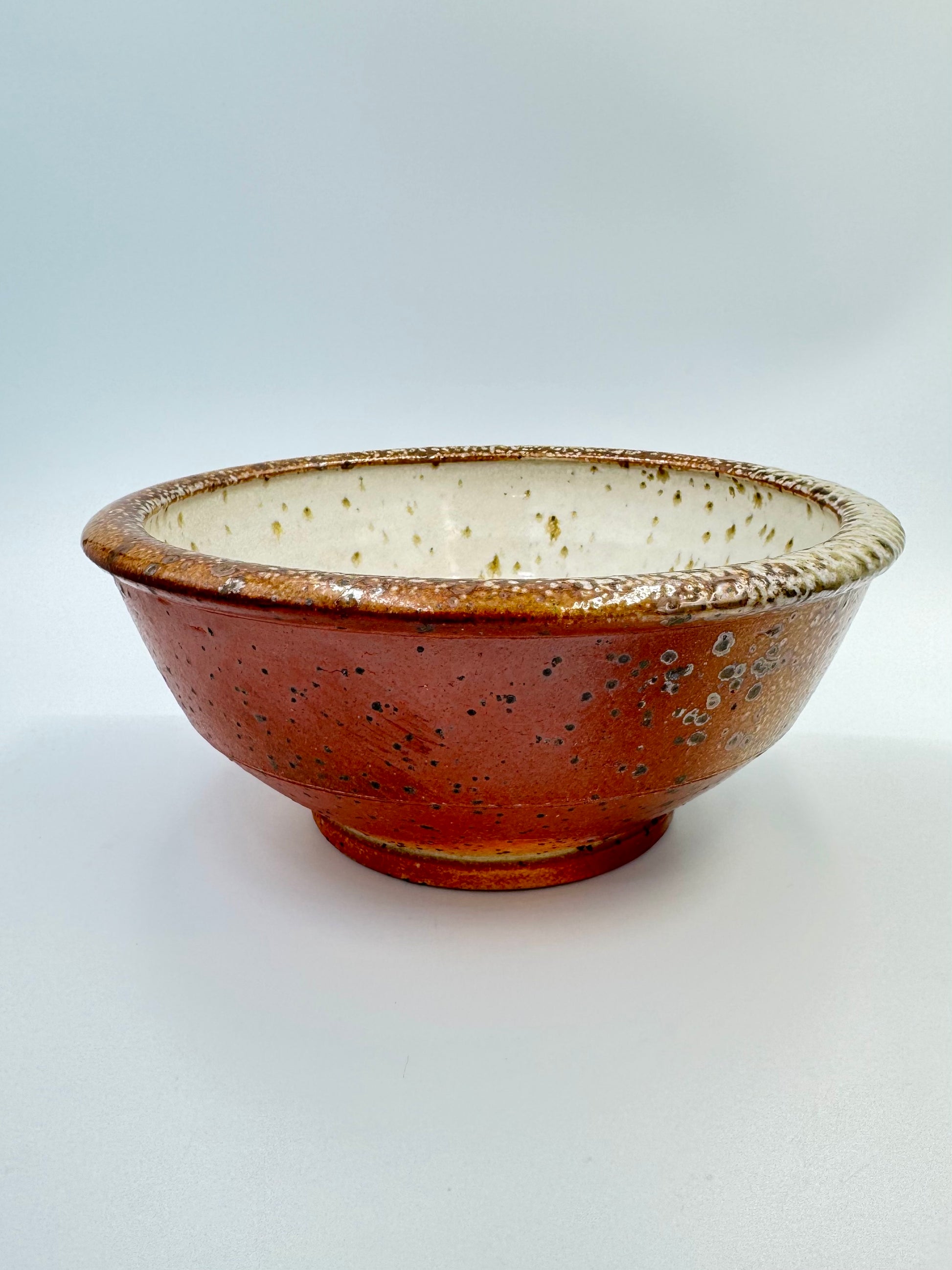 Ramen bowl with excellent warm earthy red flashing. Crushed local stone gives numerous black and white flecks. Classic soda glaze orange peel texture on one side. 1000ml approx (33oz or 4 cups)