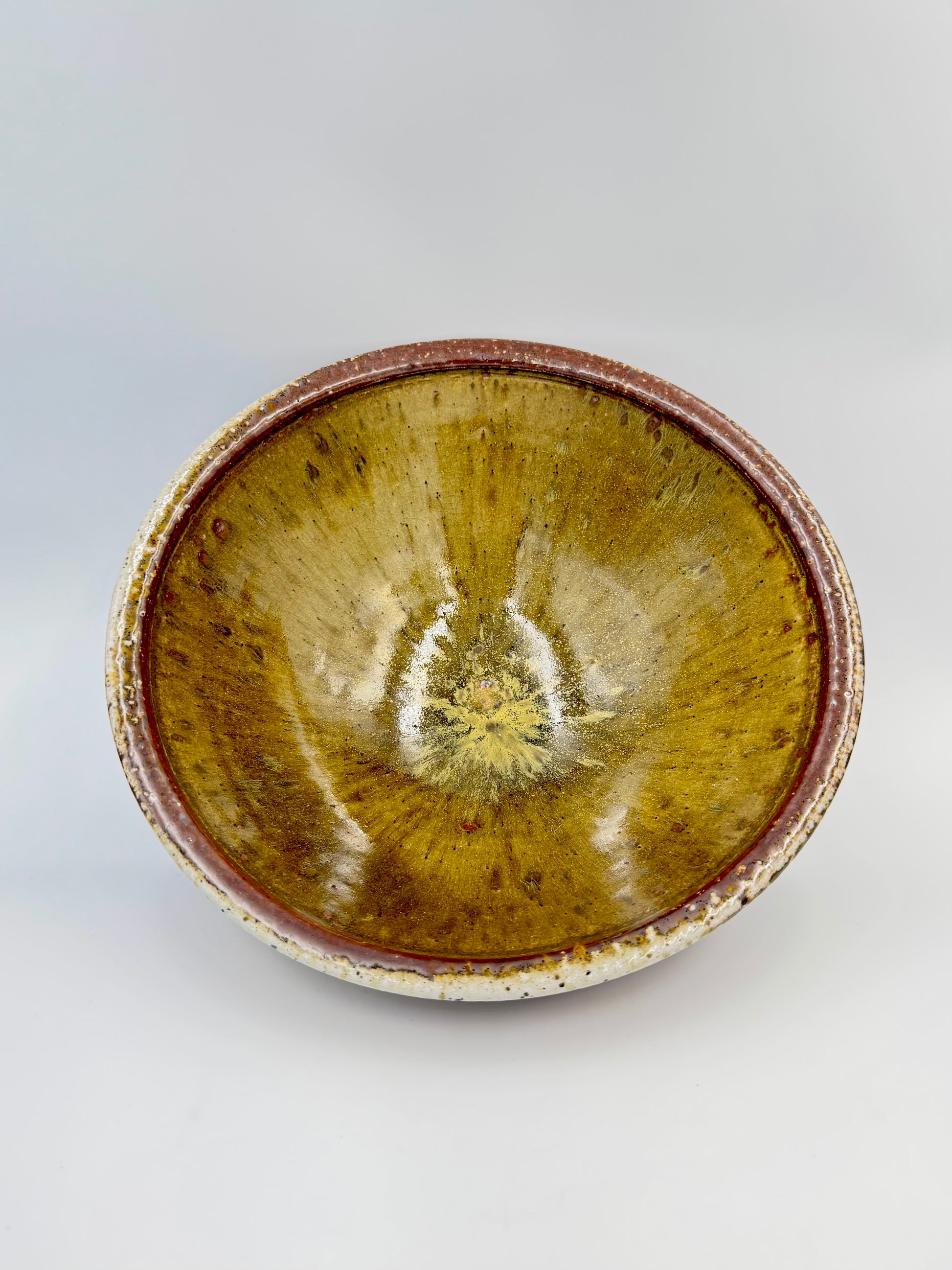 Dark stoneware serving bowl. Deep brown tonnes resulting from the local iron bearing clay. Satin almost metallic exterior surface with fine hearing bone texture. Luxurious glossy olive green interior surface. Numerous dark spots from the inclusion of local crushed stone in the clay. 2 liters (8.3cups) 27cm wide 10.5cm tall