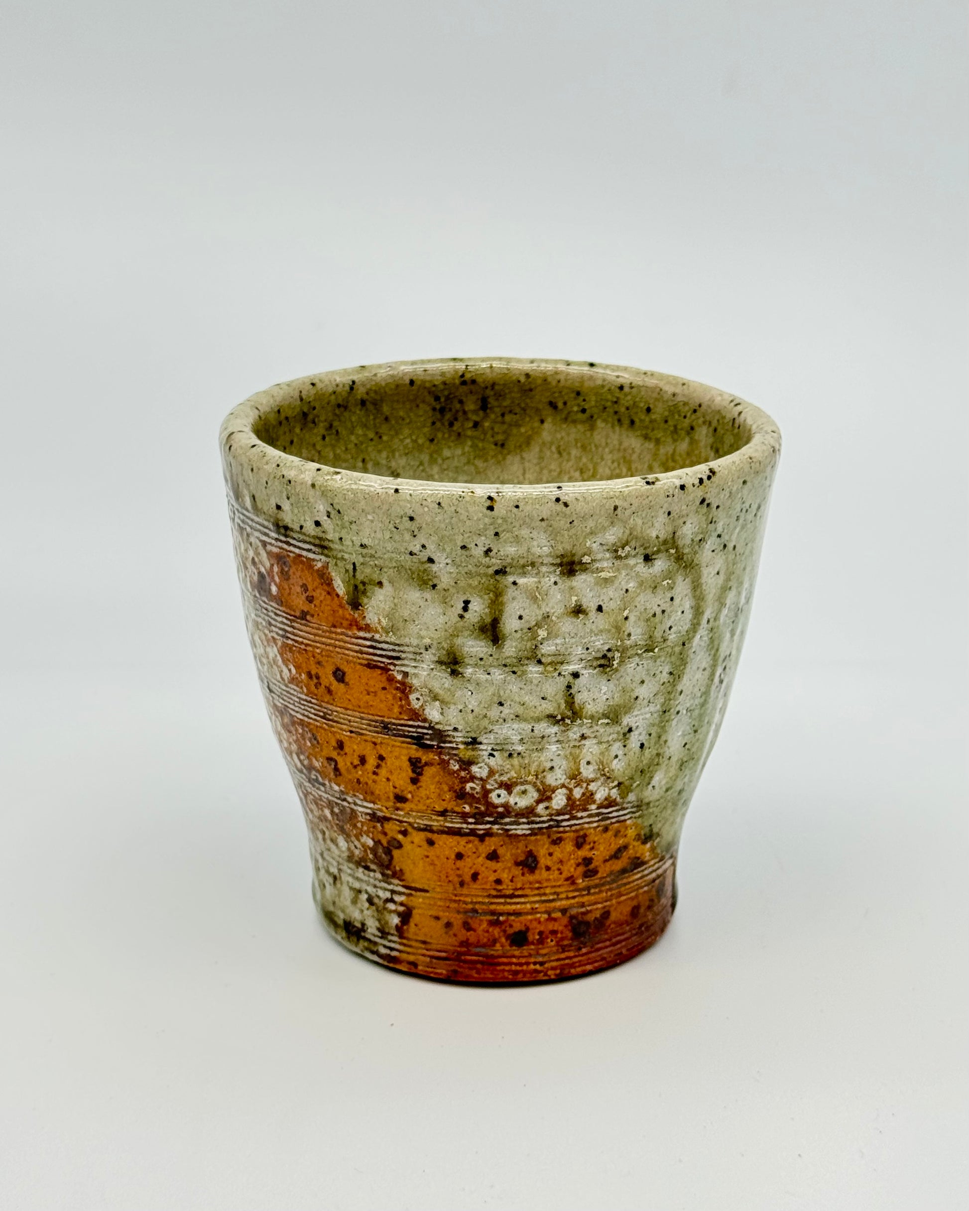 Small textured tumbler with earthy flashing and ample soda glaze and ash deposits. Local rock inclusions. 240ml (8oz)
