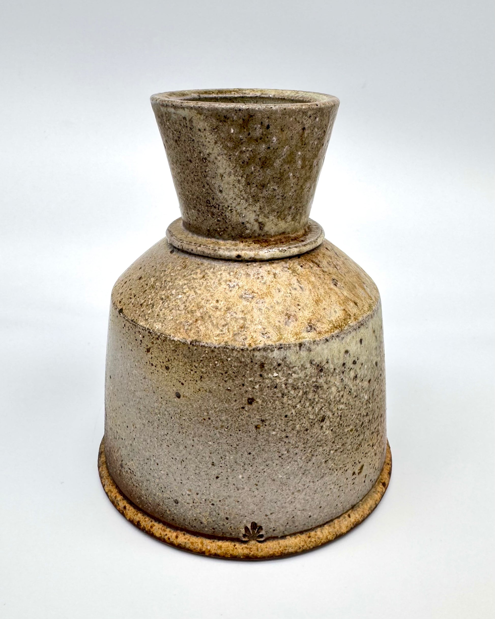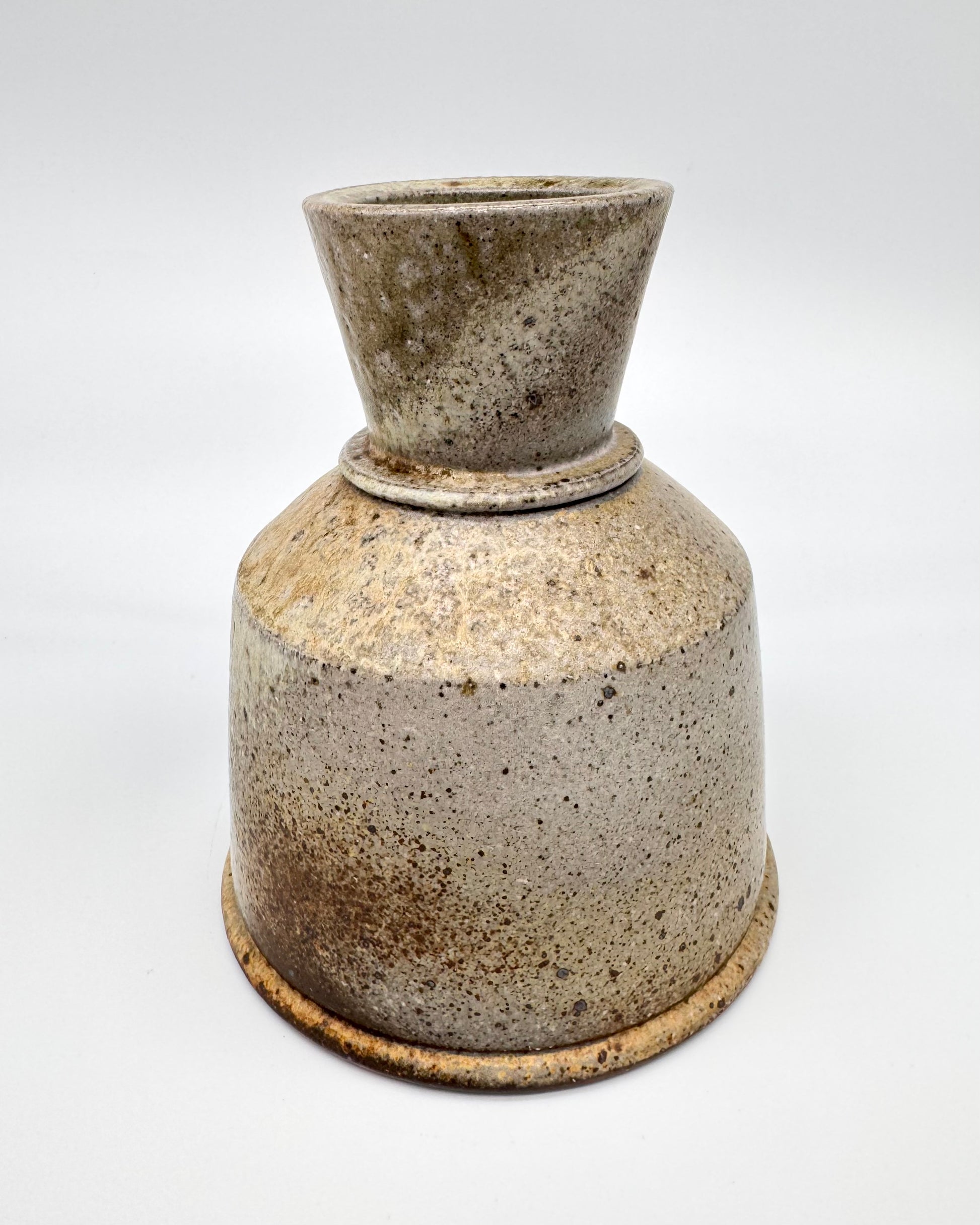 Grey vase, Stoney tonnes with subtle dark flashing. Wide base 13cm, 15.5cm tall.